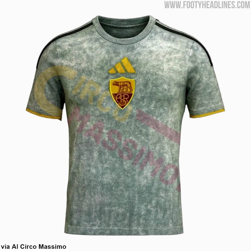 Yellow sleeve edges add a touch of contrast, while black Adidas shoulder stripes keep the design grounded. The grey crew-neck collar maintains the clean, modern feel, allowing the textured fabric and crest to take focus. This is set to be the boldest shirt in Roma’s 26-27 lineup—minimal in detail but strong in identity, aiming for both on-pitch clarity and streetwear appeal.