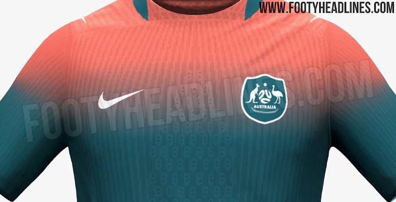 The Nike Australia 2026 away jersey features a highly unconventional two-tone gradient design. The upper chest and shoul...ders come in a striking coral-pink shade, which gradually fades into a deep teal green towards the lower half of the shirt.