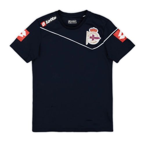 The traditional home kit of Deportivo de La Coruña features blue and white stripes, accompanied by blue shorts and white socks.