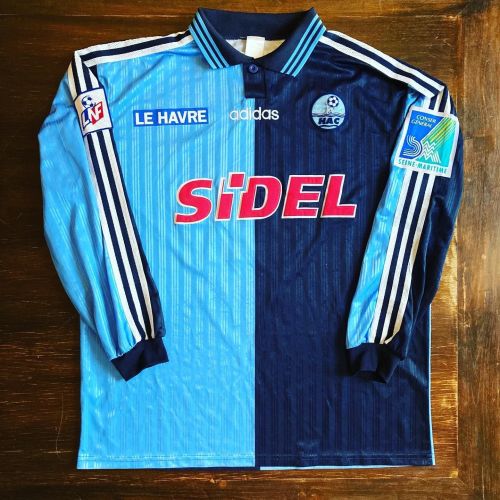 Le Havre AC's home shirt traditionally features sky blue and navy halves with white accents.