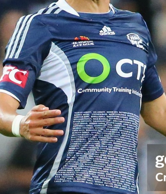This commemorative jersey celebrated (almost) 10 years since Melbourne Victory's first competitive league match against ...Perth Glory on 5 September 2005. The design is a replica of that which was worn in the Victory's first match – navy blue with white and silver side panel styling – and features the names of every capped player to that point listed in white below the chest sponsor.