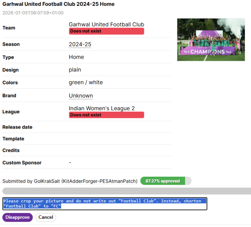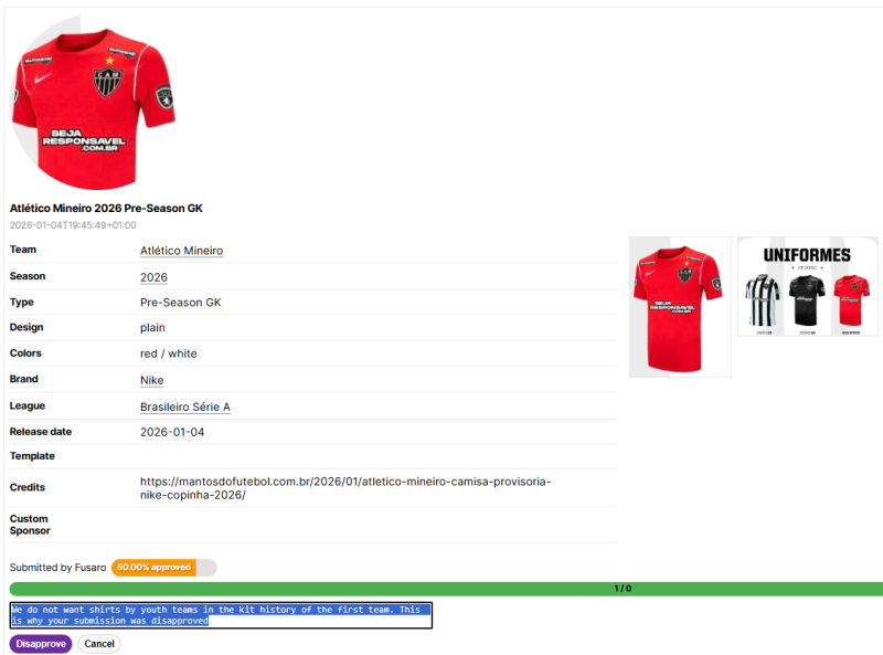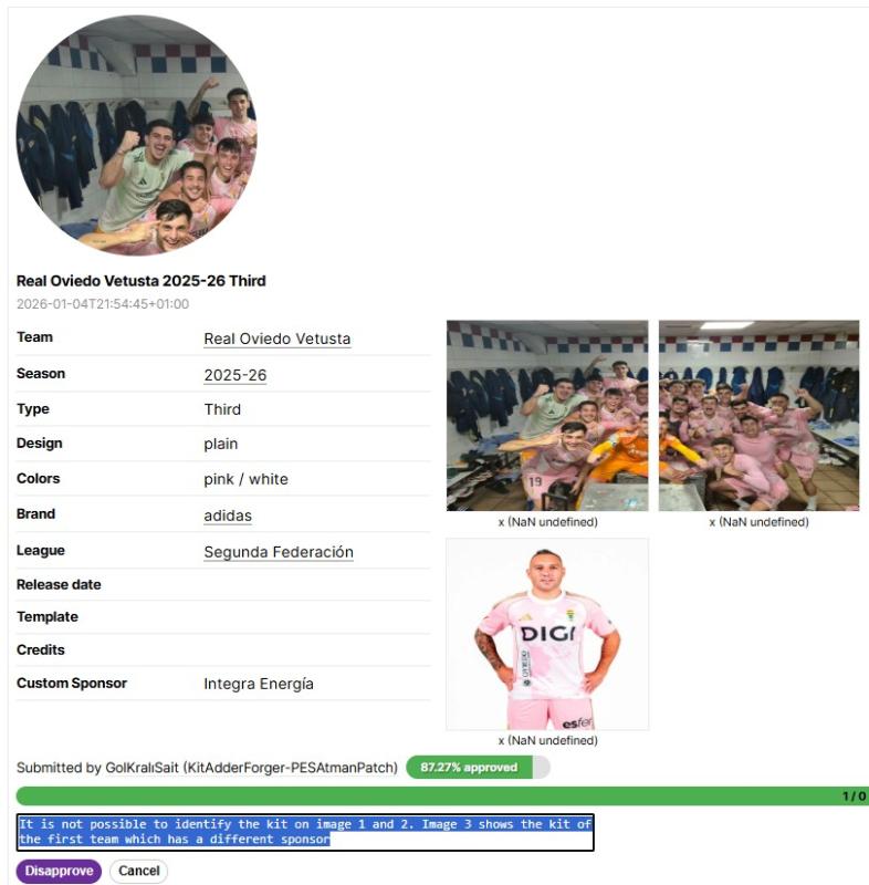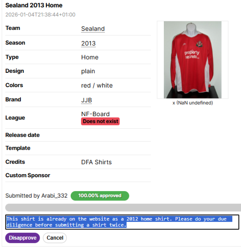 It can happen from time to time that several people upload a new football shirt for a big team. Simply search for the team's name and you will see all submissions in one list. Then, pick out one entry, and reject all other shirts.