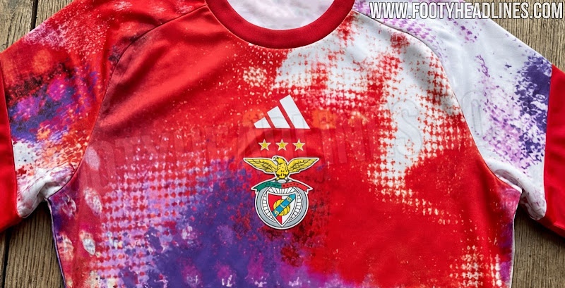 Het Adidas S.L. Benfica 2026-2027 pre-match shirt heeft rode, paarse en witte spetters over het lijf in een verfeffectpa...troon. Het opvallende shirt combineert textuur met halftoonstippen met vloeiende kleurverlopen die van effen rode mouwen overgaan via paarse en roze tinten naar witte delen, wat zorgt voor een artistieke, streetstyle-uitstraling.