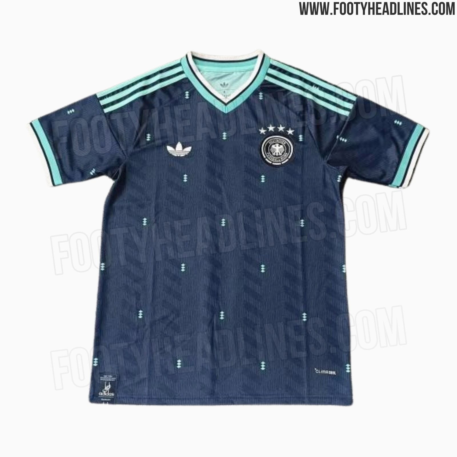 Pela segunda vez na era moderna (depois do kit de aniversário de 2025), a camisola fora de casa da Adidas Alemanha 2026 apresenta o logótipo Trefoil em vez do logótipo Adidas Performance.