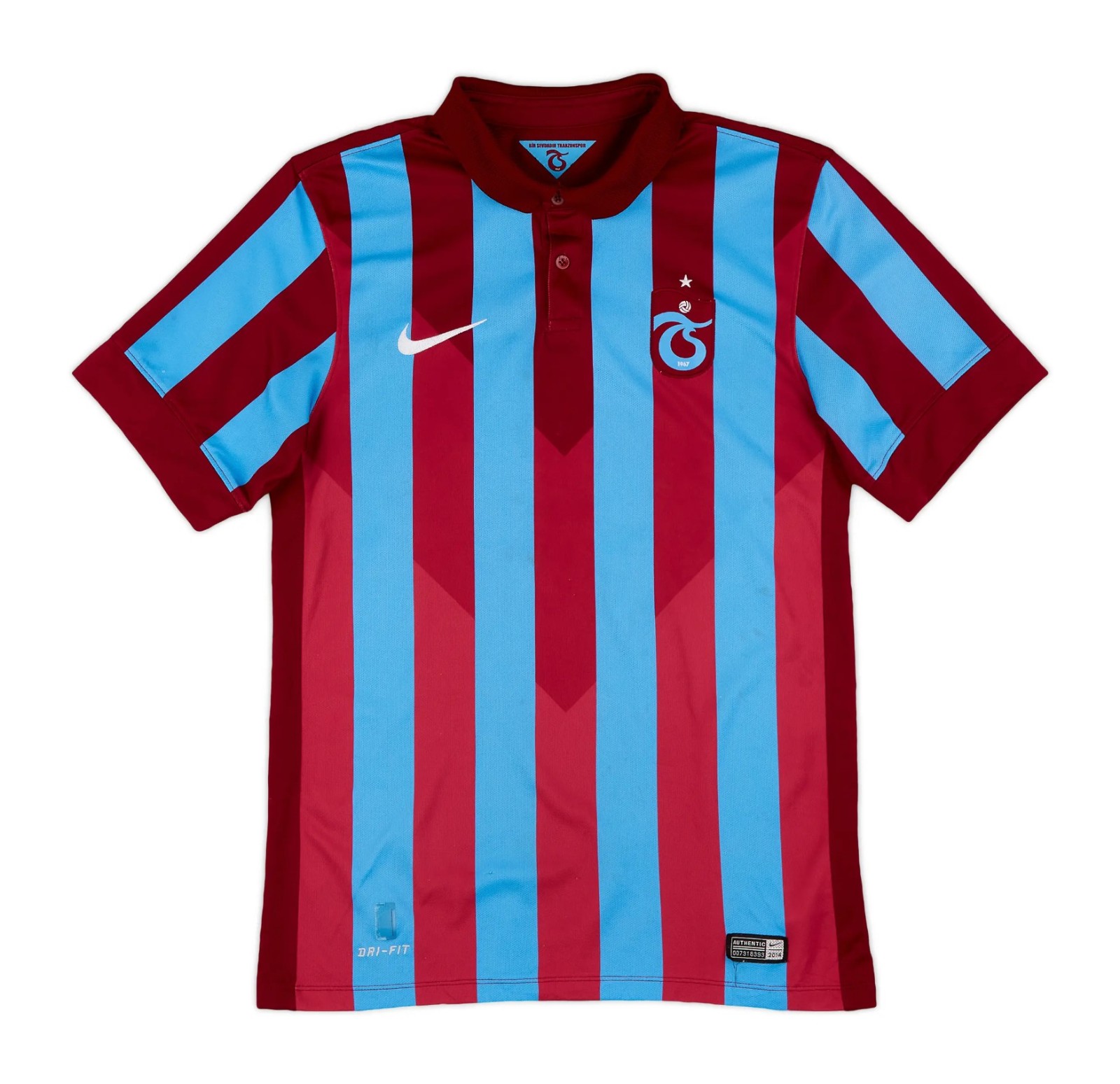 The Trabzonspor 2014-15 home kit features the traditional burgundy and sky blue striped kit design. The red stripes incl...udes three different shades of burgundy: darker around the neck, lighter at the bottom, and a tonal burgundy chevron across the chest.