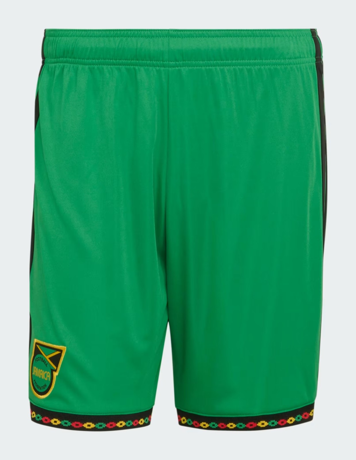 阿迪达斯于2026年2月13日发布的2026年牙买加主场球衣以黄色为主色调。它采用了黑色的Polo领、袖口和肩部三条纹,胸前饰有水平的黑色、绿色和红色波浪条纹。